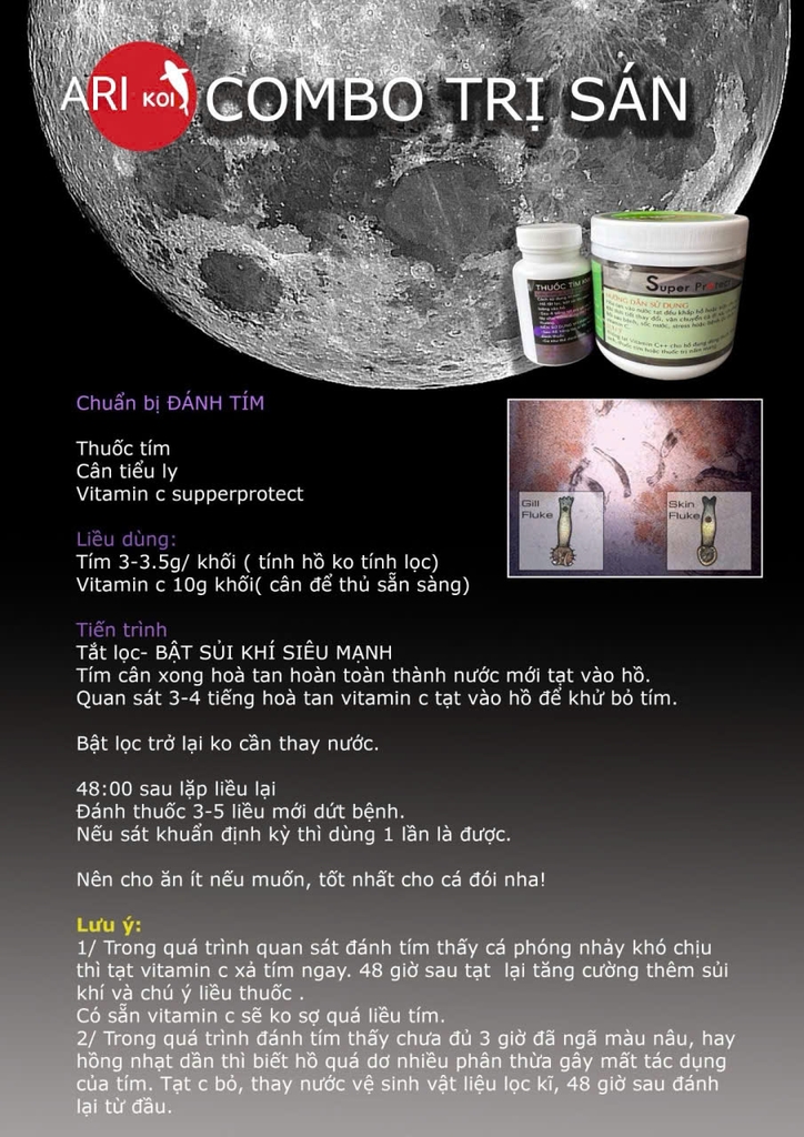 - Liều khử trùng hồ và lọc: Sử dụng thuốc tím tinh khiết liều cao: 10-20g / khối nước. Cho chạy bơm lọc và máy sục khí liên tục trong 24-48h. Sau đó dùng Oxy già hoặc Vitamin C++ Super Protect vào khử thuố c tím. Đợi nước trong lại thì xả bỏ toàn bộ nước trong hồ. Xịt rửa toàn bộ hồ và vật liệu lọc. Vô nước lại.